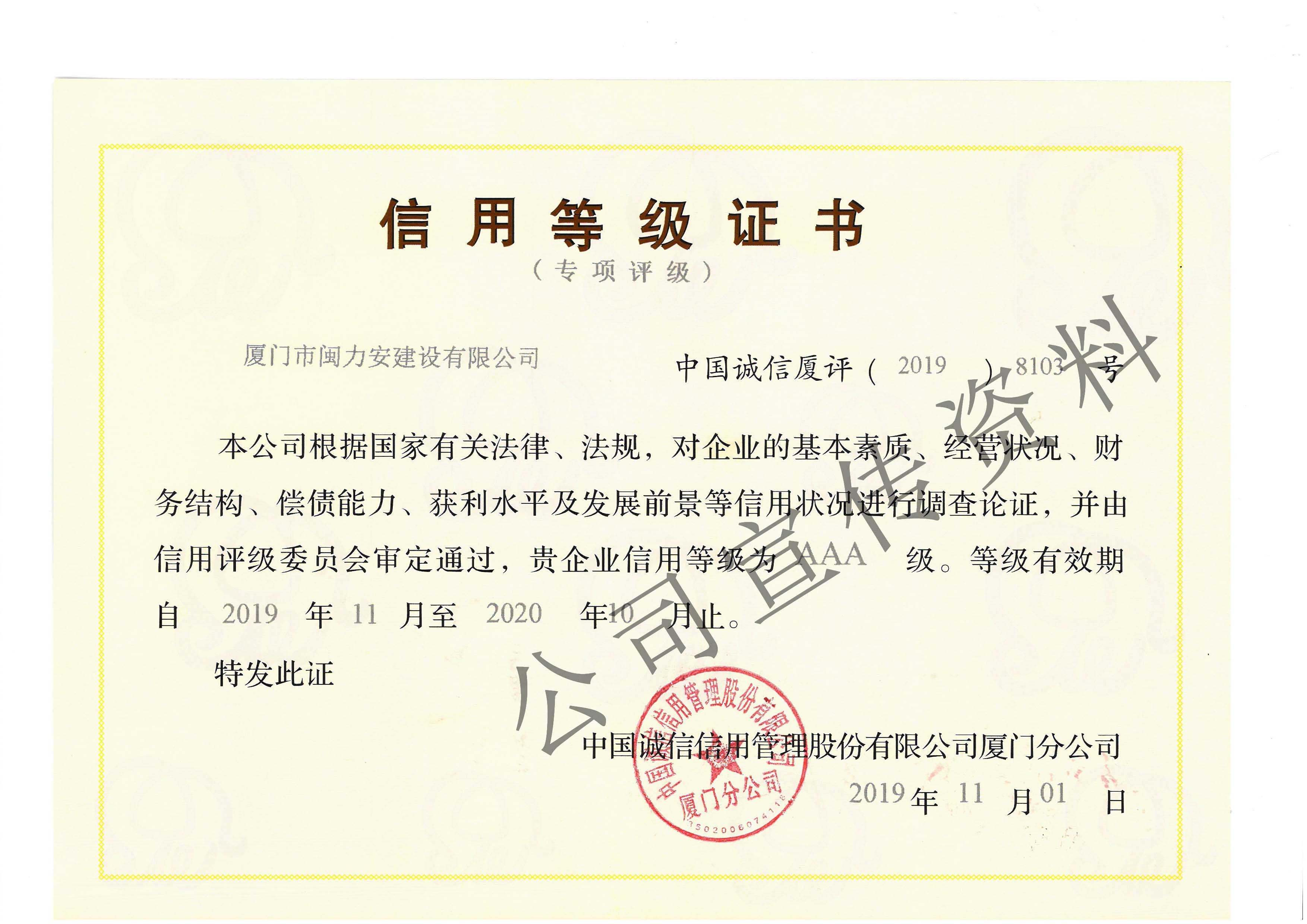 祝賀閩力安取得:信用等級(jí)證書(shū)