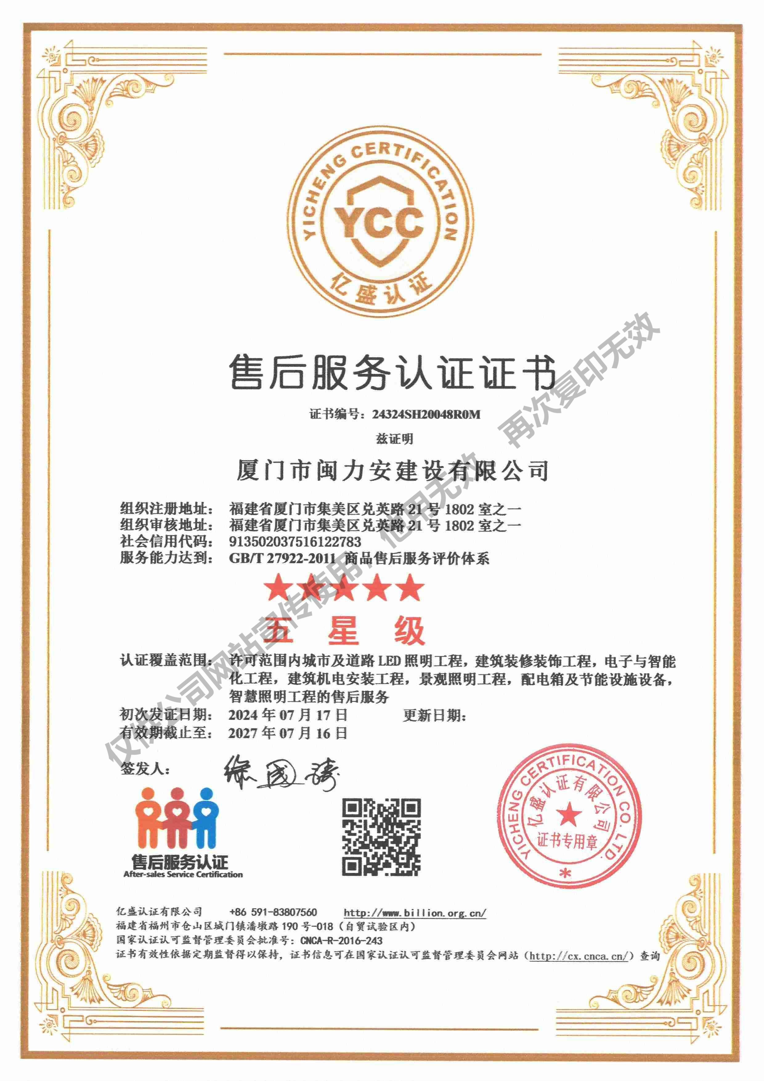 祝賀閩力安取得:售后服務(wù)認(rèn)證證書(shū)