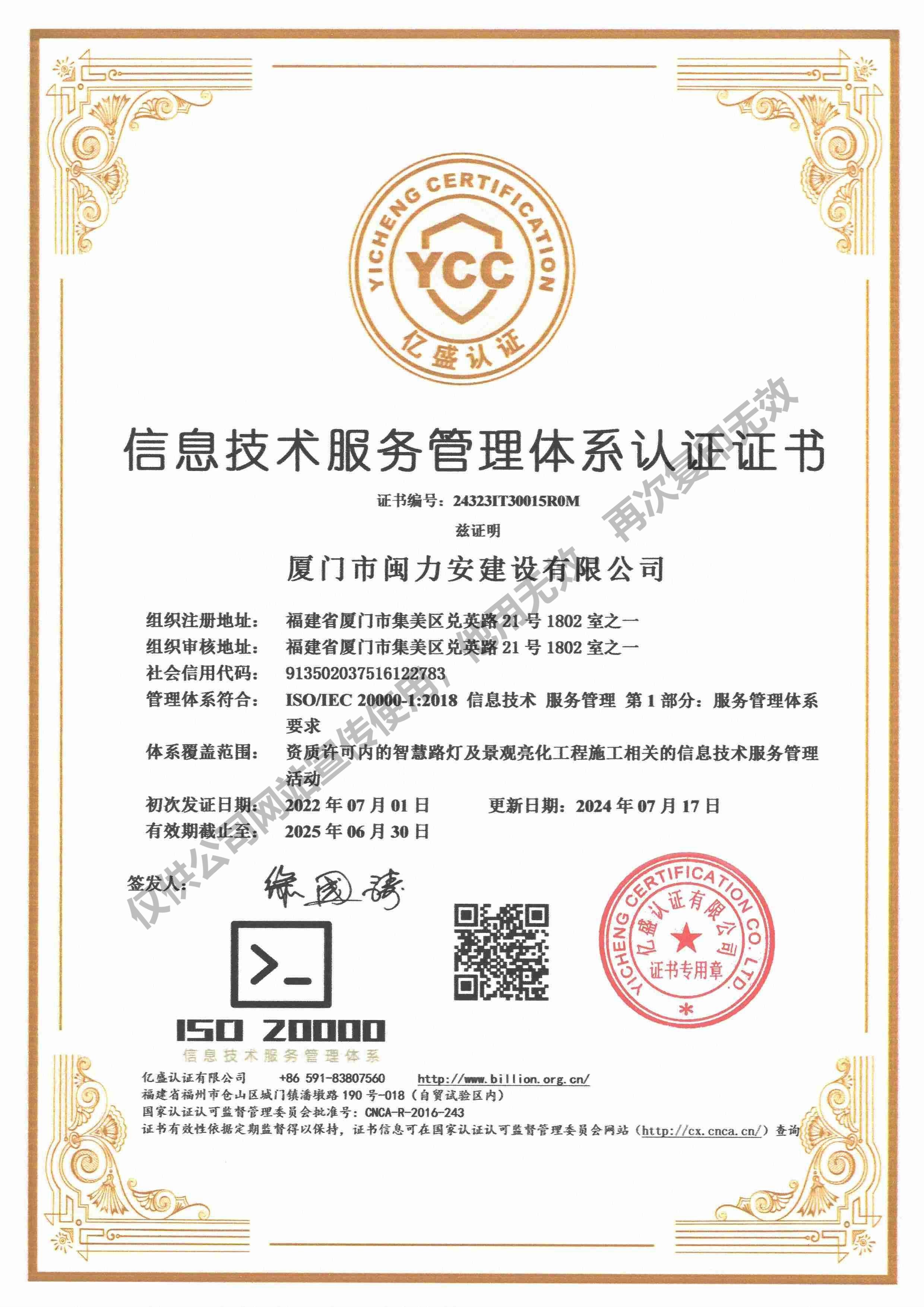祝賀閩力安取得:信息技術(shù)服務(wù)管理體系