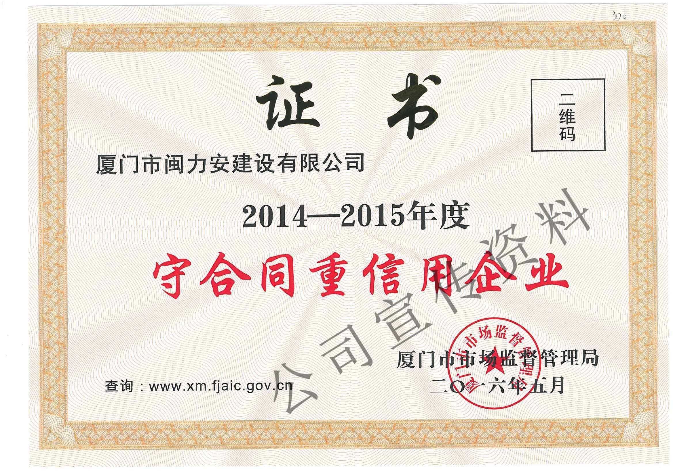 祝賀閩力安榮獲:廈門市重合同守信用企業(yè)
